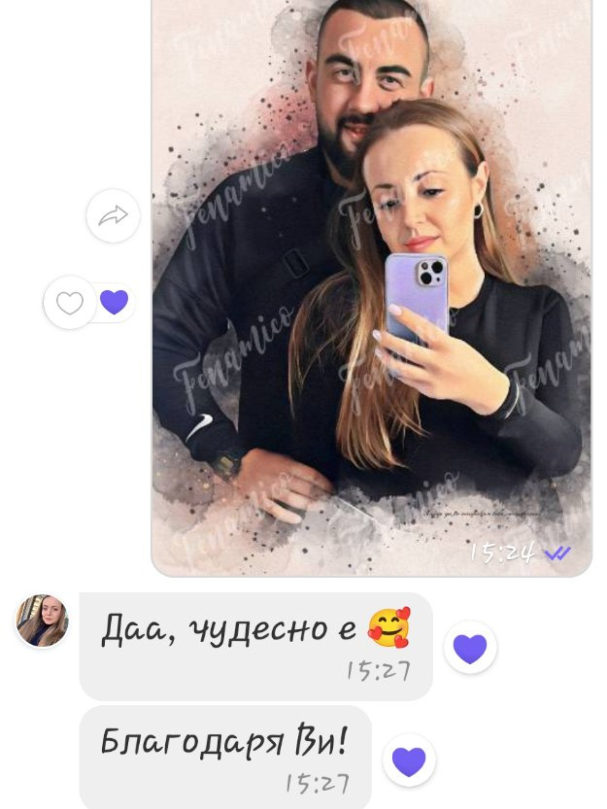 Уникални портрети направени с много прецизност и внимание към всеки детайл! Благодарим ви! Със сигурност бих поръчала отново и отново!