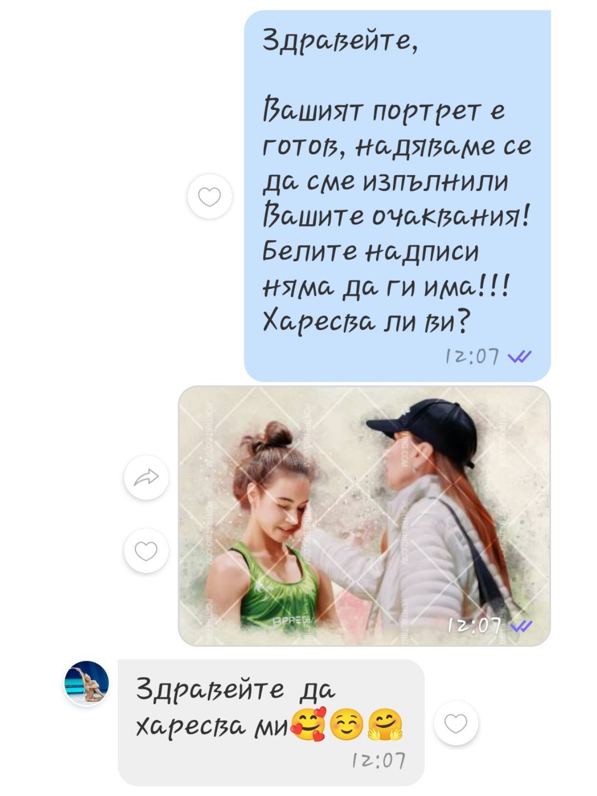 Виж преди да платиш!!! При поръчка получавате БЕЗПЛАТЕН ПРЕГЛЕД по вайбър/имейл или фейсбук преди портрета да бъде разпечатан. Ако нещо не ви харесва след като видите портретът може да го редактираме докато сте 100% сигурни, че ви харесва или да откажете поръчката.
