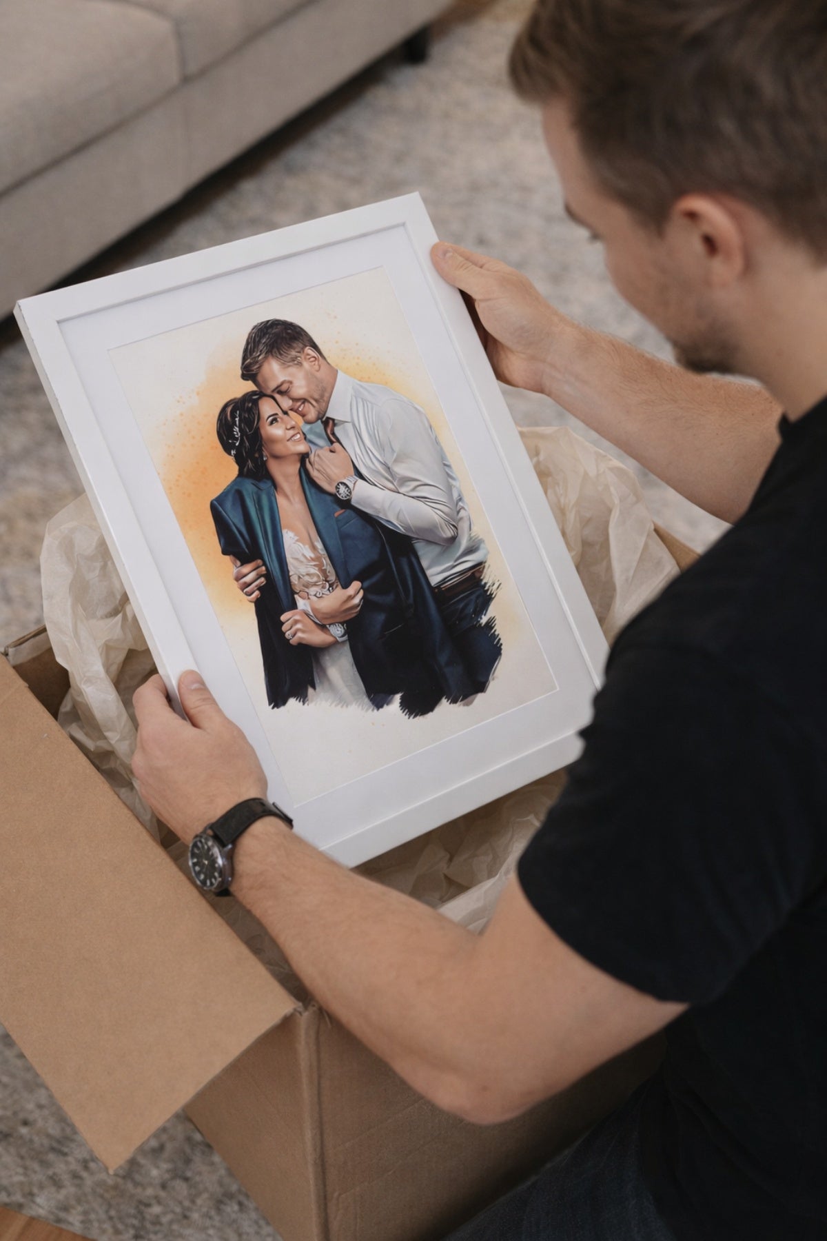 Получавате портрет по ваша снимка рамкиран в МДФ рамка със стъкло в бял цвят. Имаме опция за 3 размера А6 (10х15 см.), А4 (21х30см.) или А3 (30х40 см.) За по-големи размери се свържете с нас!